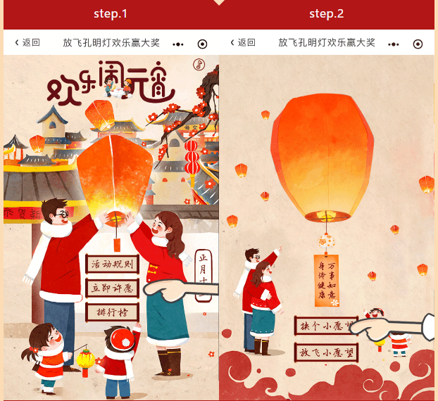 在古代,元宵节的时候人们会结伴出门放花灯,许下新一年的欲望。惠州农商行借此契机,与快创科技合作,开发微信H5游戏插件,推出为期两天的放飞孔明灯游戏,迎接元宵节的到来。