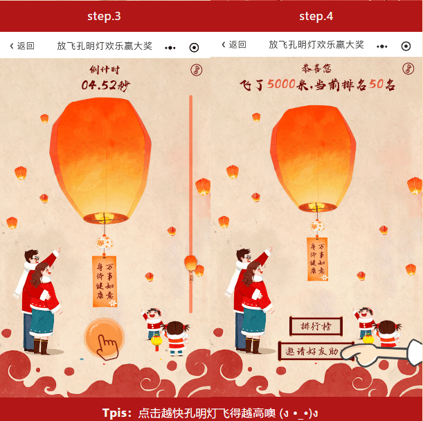 第三步,点击按钮,在有限的时间内放飞孔明灯,点击得越快,孔明灯就会飞得越高;
